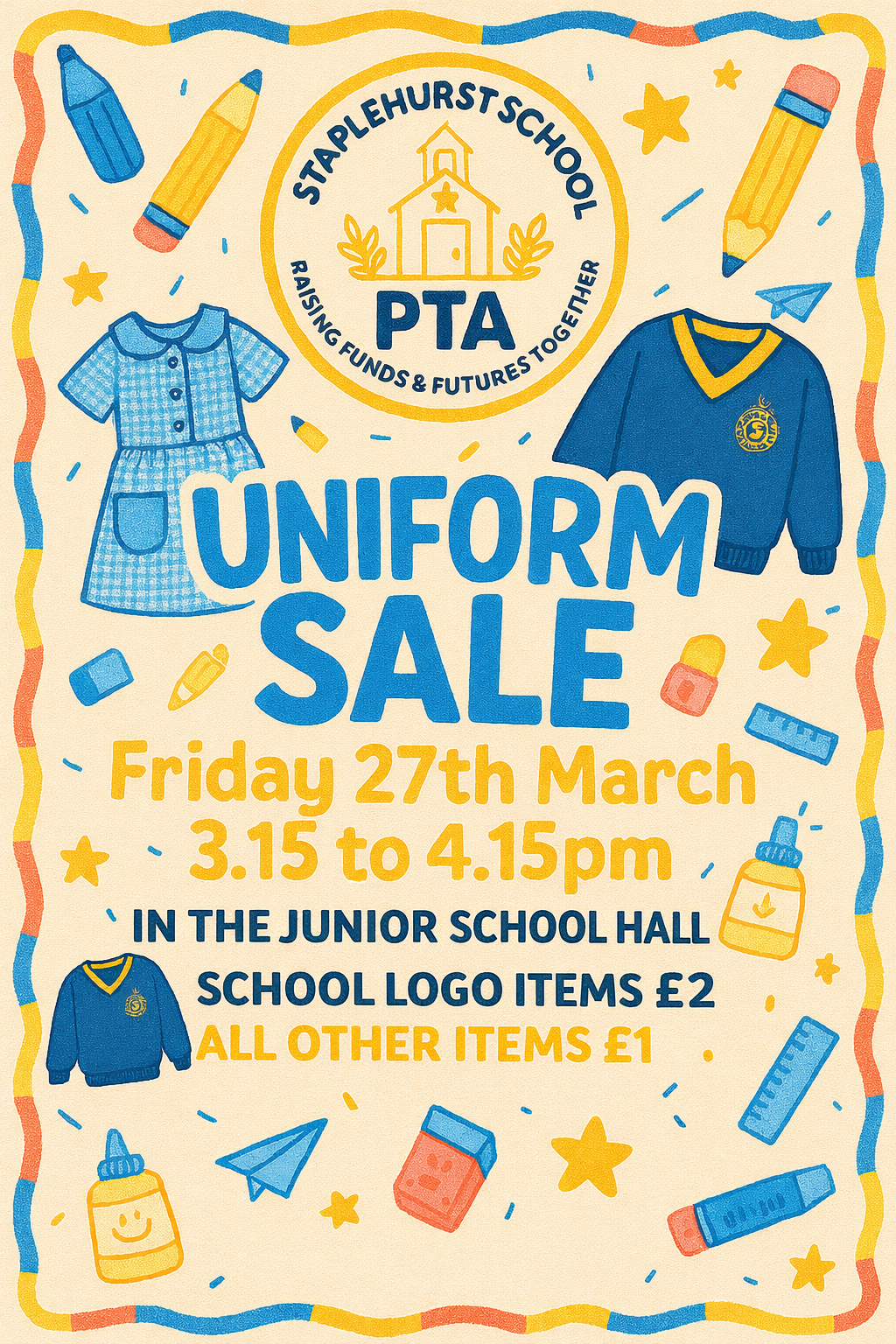 The Staplehurst School PTA will be holding a Uniform Sale on Friday 27 March. The sale will take place in the Junior Hall from 3.15pm to 4.15pm.