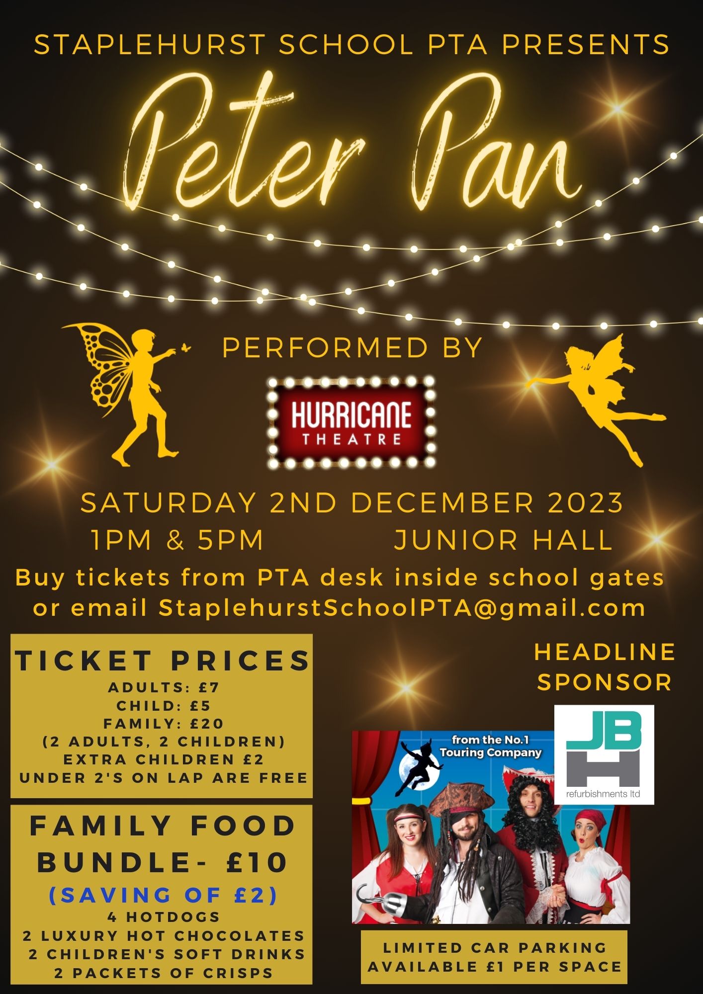 PTA will be holding their annual pantomime performance on the 2nd December in the Junior Hall. This year, Hurricane Productions (our chosen professional theatre company), will perform Peter Pan.