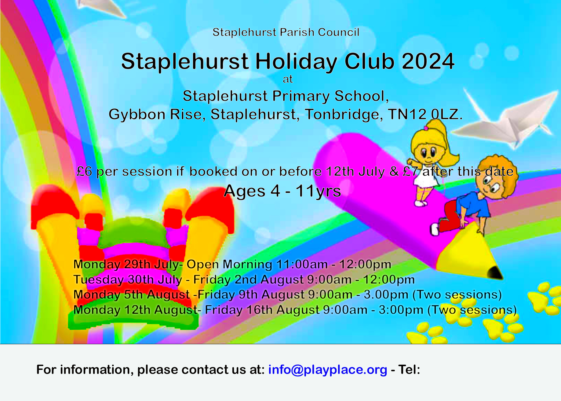 Please click on this link for details of the Holiday Club organised by Staplehurst Parish Council.