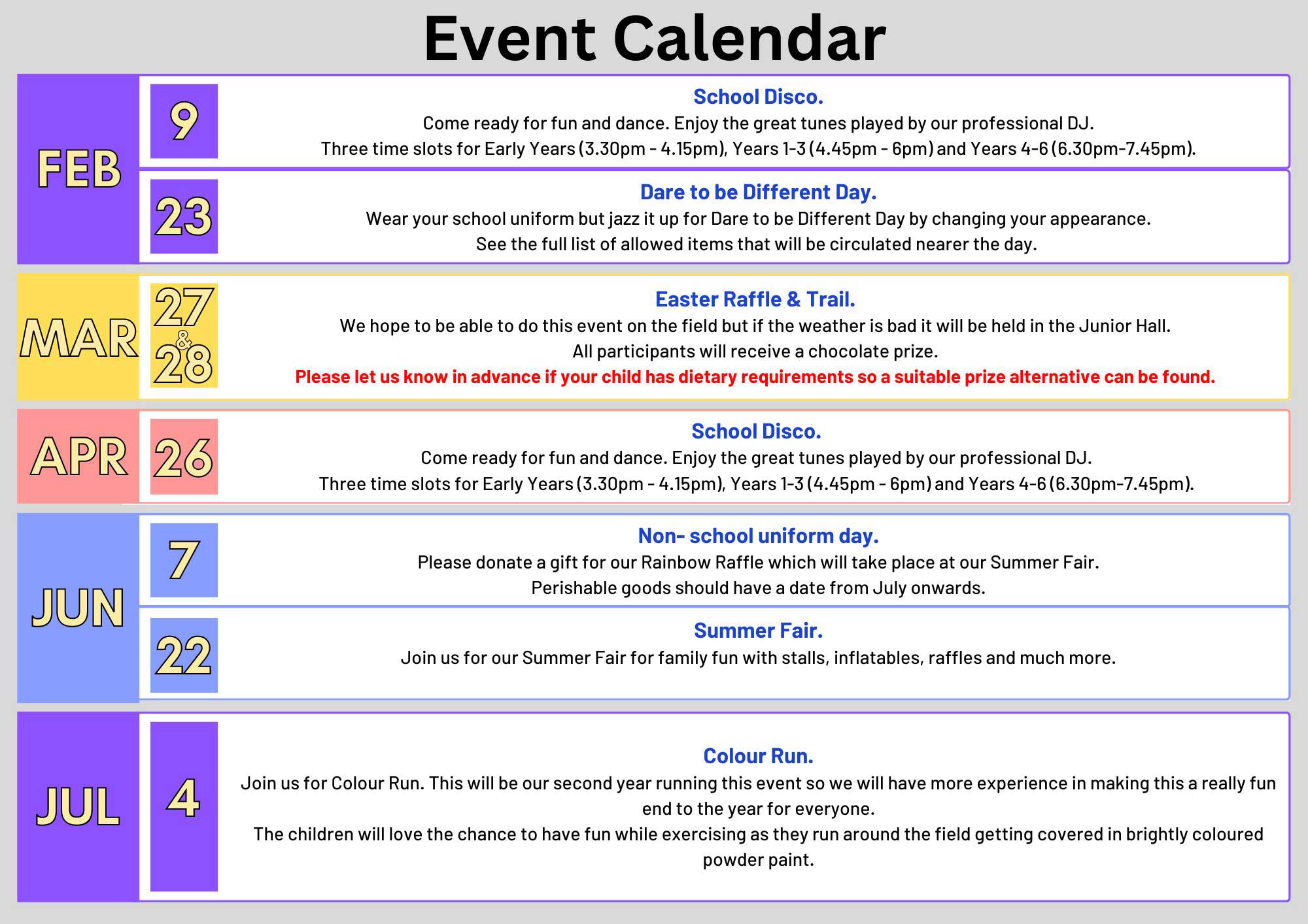 Regular events include Discos, the Summer fair, the Welcome back BBQ in September and our Pantomime. Other events include our Easter trail, our Santa shop and in the summer we do cake and ice cream sales, Uniform Sales.
