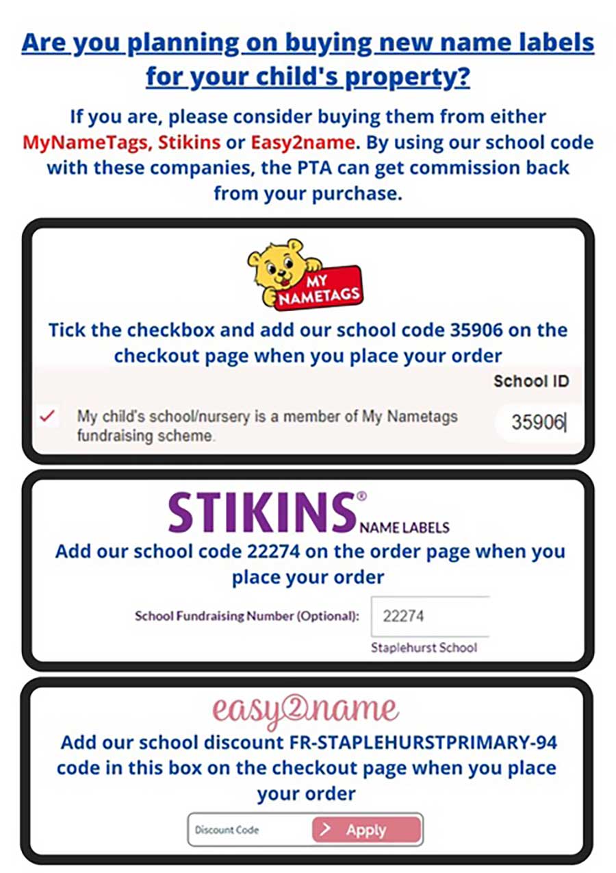If you purchase things online then why not sign up to Easy Fundraising and your favourite brands will donate to the school. Just enter Staplehurst School PTA as your choice and continue your online shopping as normal (www.easyfundraising.org.uk)